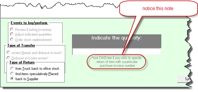 Anyway, if you you want this option, just follow the normal sequence for indicating a return of items to vendor (it is F10-->Transfer-->Return-->Supplier). You'll be prompted to indicate the applicable part number (which widget?), then to indicate the quantity. At such a point, the relevant portion of your interface will look similar to the following: