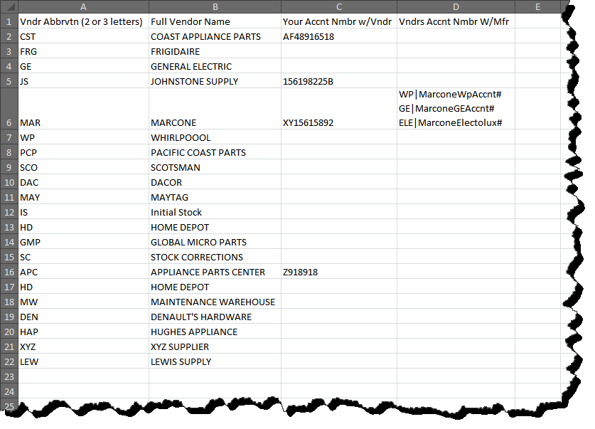 Suppose Marcone is a company you buy warranty parts from, and as connected for work you do for Whirlpool, GE and Electrolux. You'd want to click into the cell that corresponds with the row you have made in the spreadsheet for Marcone, and in the column under "Vndrs Accnt Nmbr w/Mfg" (in particular, Column D). In that cell, first type the QET abbreviation you have setup for Whirlpool, then the bar symbol ("|", it's just above the Enter key on your keyboard), then whatever is Marcone's distributor account number with Whirlpool. Then hit Alt-Enter on your keyboard. This creates a sub-line within the cell. Now type the QET abbreviation you have setup for GE, then the bar symbol, then Marcone's distributor account number with GE. Finally, hit Alt-Enter again on your keyboard, then type the QET abbreviation you have setup for Electrolux, then the bar symbol, then Marcone's account number with Electrolux. You'll end up with cell contents that look roughly like as shown in Cell D-6 above.