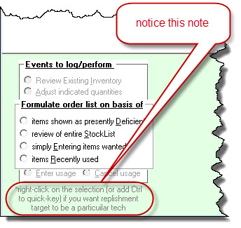 If you did not know, until this release the "Order Restock on Basis of Items Presently Deficient" method assumed you are ordering for the entire company, system-wide, with expectation shipment will be made to the main location, and with intent you will use other facility thereafter (also within the Inventory Control form) to parcel out to each tech according to need.