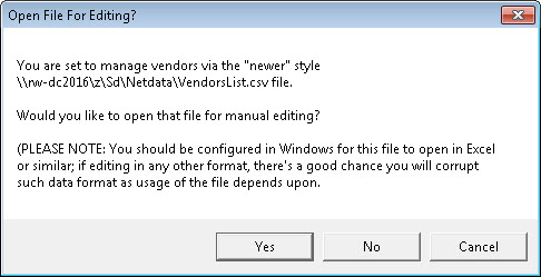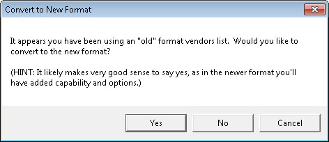If you consent to make conversion to the upgraded method, the system will do precisely that. In particular, it will supersede the old file that was formerly used to keep track of your vendors. It will take information from that old system and place into a new file (placed into your NetData folder and title VendorsList.csv). -- in particular, a new file which will have more capability, and is now easily editable. After you've accepted the option to do this, if you pick again from that same MainMenu item as shown above, you'll see this:
