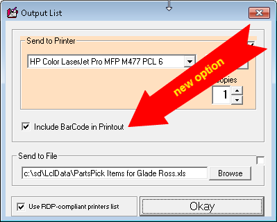 In the same PartsPick form as above discussed, there has long been an option to print any particular technician's "PartsPick" list. Now, when you choose to print and are presented with the "Select Printer" dialog box, you'll see there is a new option checkbox that, if checked, will cause the printout to include barcodes: