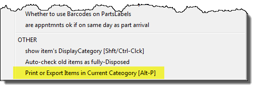 The main concept for working within the F8 form is to do work on-screen. Given this, the primary print or file-output options we've had, there, have been as intended for provision to others (e.g., when ordering parts and needing to provide order info to the vendor). There has also been provision to print labels for parts. And, if wanted, it has forever been true you can print what's presently shown on the screen by using SD's universal "Print-what's-shown" command, which is Ctrl-P. However, there has been no provision for doing a complete output (whether to printer or a file) of all items that fit within the presently-selected display category. That is the option now added. It is accessed via Alt-P, and shows as an option in the contextual CheatSheet: