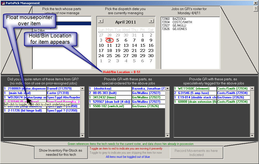 You might notice there have been five releases since the last prior (just below) announcement here. These have included been many small, incremental improvements (and in multiple areas). In particular regard to the new PartsPick interface, experience disclosed certain initial weaknesses (in particular, circumstances where the system might have indicated a potential need for a part to be returned by a tech, but did not), that have now each been addressed. Additionally, Adam Butcher pointed out that it would be nice to see the Bin/Hold Location of a part, right within the interface. That now occurs. Assuming such a field is applicable, as you float your mousepointer over any parts-listed item,