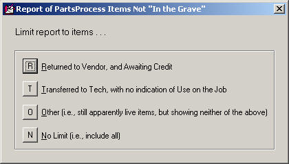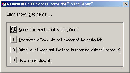 "To-Grave" Improvement #2. As part of the above-described Ver. 4.3.99 release, we introduced a new filter and new report in the archived-PartsProcess form (Ctrl-F8) -- a pair designed to let you review, for appropriate management, those particular s/o items that had been ordered and received, but had no entries indicating a final and proper disposition. As per original design, those showings were somewhat general in that they included all items not yet in the grave, without segregation as to category. With this release, segregation is now offered. Specifically, when you pick either of those options, you'll next see a dropdown that asks what sub-categorization you'd like.