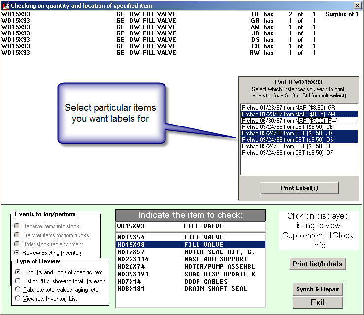 This release solves that. Specifically, when you choose to print labels as pertaining to a particular part number (from the F10 form use the option sequence "Review existing inventory" and "Find qty and locs of specific item," pick an item, then click on the "Print list/labels" button), you'll get a list showing each instance.