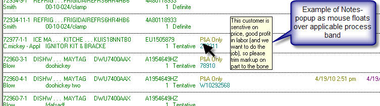 This release address both matters. Regardless of whether you're in the Current- or Archived-PartsProcess forms, ServiceDesk will now display any underlying Request-Notes, in a ToolTip-type fashion, as your mouse floats over a process-band to which such notes are applicable.