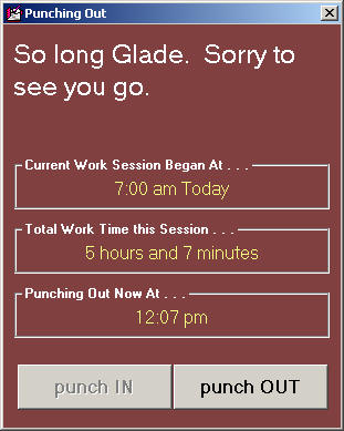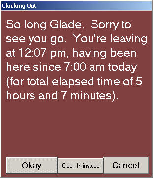 Please note the improved simplicity of now having only two buttons, and it's only the button that reflects the expected action that's enabled (in prior design, the "Okay" button did double duty for both actions, depending on the circumstance -- which sometimes led to be people getting off-synch, thinking they were punching In when punching Out, and vice versa). The new system also has a much improved method for coping with a forgotten prior-punch event (e.g., I need to punch In this morning, but it turns out I forgot punch Out last night, or vice versa). The old system would permit the present needed punch (via its bottom-center button), while leaving as unresolved the prior (and forgotten) opposite punch. With the new system, even though the unexpected of the two buttons appears to be disabled ("punch IN" in the above example) it will still accept a click. If you click on the disabled button, it invokes a dialog where a forgotten "punch" event can be manually provided. In this event the TimeCard file is appropriately marked to indicate that that punch was input manually (thus, as a manager you can know to potentially consider that punch as suspect).