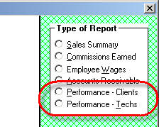 In particular, all of the performance reports have been upgraded in some degree. There are presently six such reports overall. Two under "Performance -- Clients," and four more under "Performance -- Techs" (the illustration shows only the two headings, which must be clicked to see the lists of respective reports from which to choose).