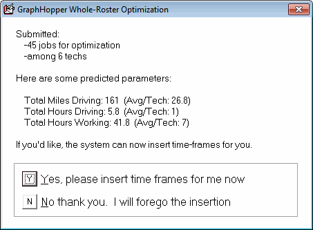 If you constrain what GraphHopper can do by having a lot of jobs that are already "definite-status" assigned to particular techs; if you further constrain it by having a lot of jobs that already have a time or time-frame assigned. . . well . . . those things necessarily limit just how elegant it is that GraphHopper can otherwise make the optimization. Ultimately, it must work within the constraints you give it. If you can, give it a whirl with an unconstrained roster and see how beautiful that looks. Regardless, if you see sequences and assignments that look less than optimum, we suggest you try your abilities by comparison. We doubt you'll be able to do it as well.