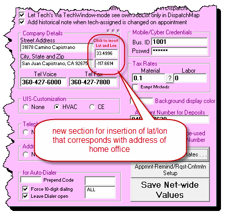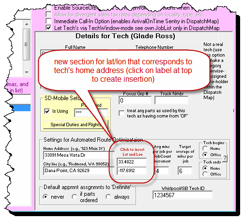 First, there's a new feature in the Technician Properties window. You can now enter the latitude and longitude that match the technician's home address. Please ensure the technician's address is already there, then click on the label as instructed. The corresponding latitude and longitude for the address will be filled in automatically. This is done by using Google's Address Verification.