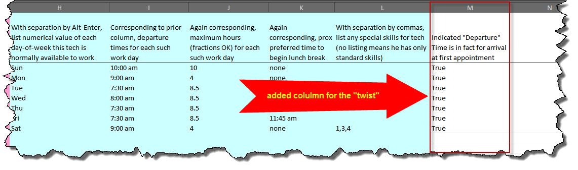 If you have a specific-to-weekday start listed in Column I of the same file, and if the day you're optimizing corresponds with that weekday, that start time will supersede what's found in Column B.