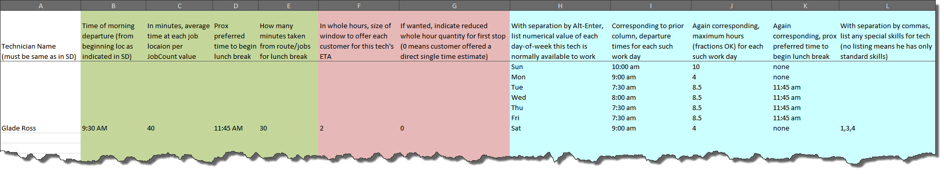 In the given format, you'll create a record (or row) for each technician (please remember to delete or replace the example row in the template as it doesn't describe your technicians). The headers are self-explanatory, but we'll also provide an illustration and further descriptions to help.