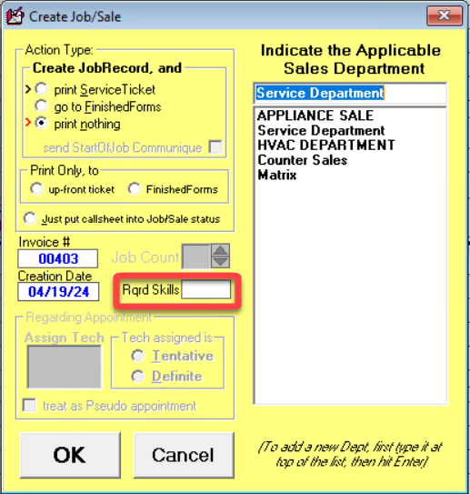 Thirdly, there's a new box now in the Create-Job/Sale interface. You can click on it during the job creation process to show that the appointment being created needs special skills or that any appointment for the job requires these skills.