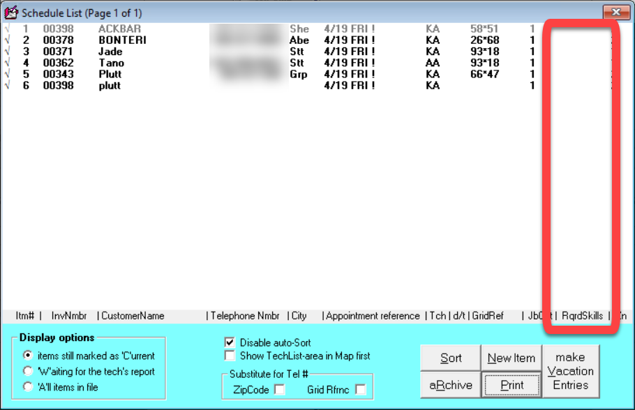 First, the F6 ScheduleList interface has a new column wherein the required skills for any appointment can be indicated: