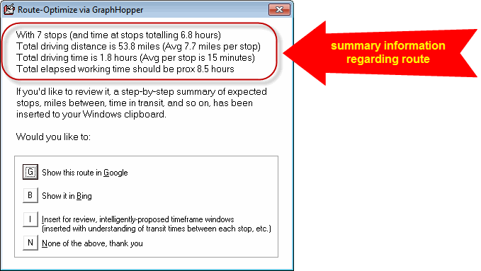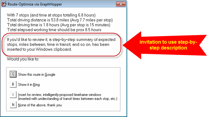 That sentence means that your Windows clipboard now contains detailed information about the route. If you paste (Ctrl-V or right-click and pick paste from the popup) into any text editor (e.g., NotePad, WordPad, etc.), you'll see something like this: