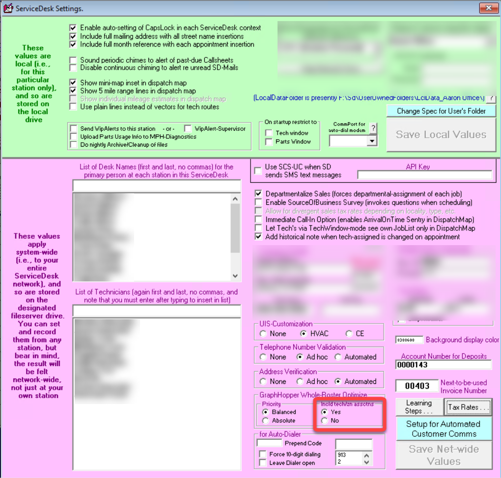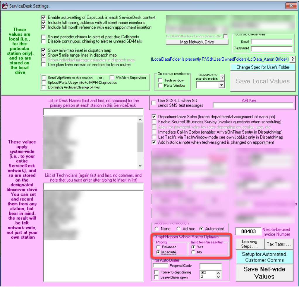 The blue section is for "Stage-2" of optimization, which optimizes your entire schedule of appointments. Some fields in this section can override settings in the green section. For example, the blue section will reflect this if a technician usually starts at 7:30 AM but starts at 9:00 AM on Saturdays.