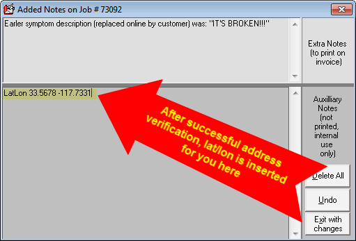 GraphHopper, while more complex than MapPoint or Google, requires latitude and longitude for address submission, unlike the more straightforward address format used by the others. ServiceDesk obtains this information through the address-verification system described here. From version 4.8.148 onwards, successful address verification will add a note with the latitude and longitude in the MoreInfo box of the Callsheet or JobRecord.