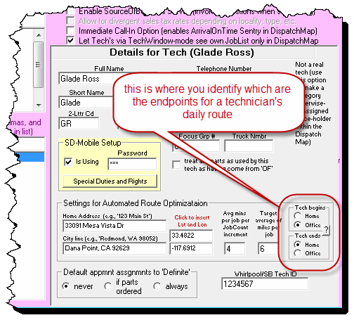 You can specify each technician's start and endpoints. This can be done in the Technician Properties window, accessed by clicking on a technician's name from the Tech-Roster section in the Settings form (Ctrl-F1). Here, you can fill in the technician's address and use the radio buttons to indicate if the start and end points are the technician's home or office.