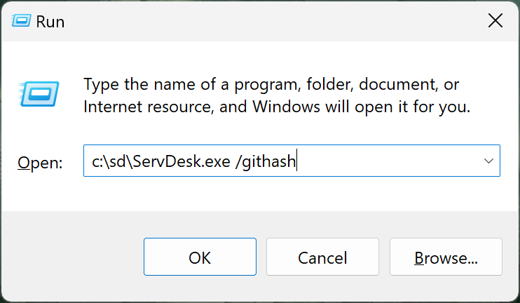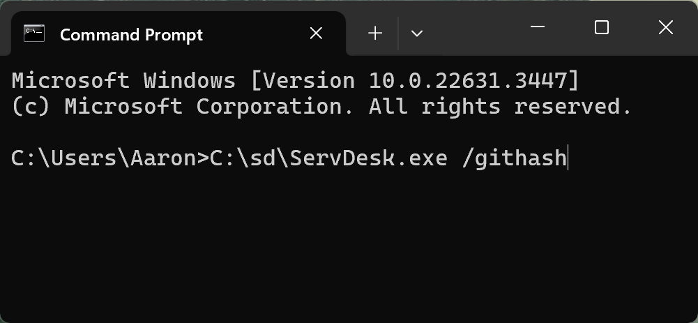 In the CMD window, type "C:\sd\ServDesk.exe /githash".