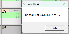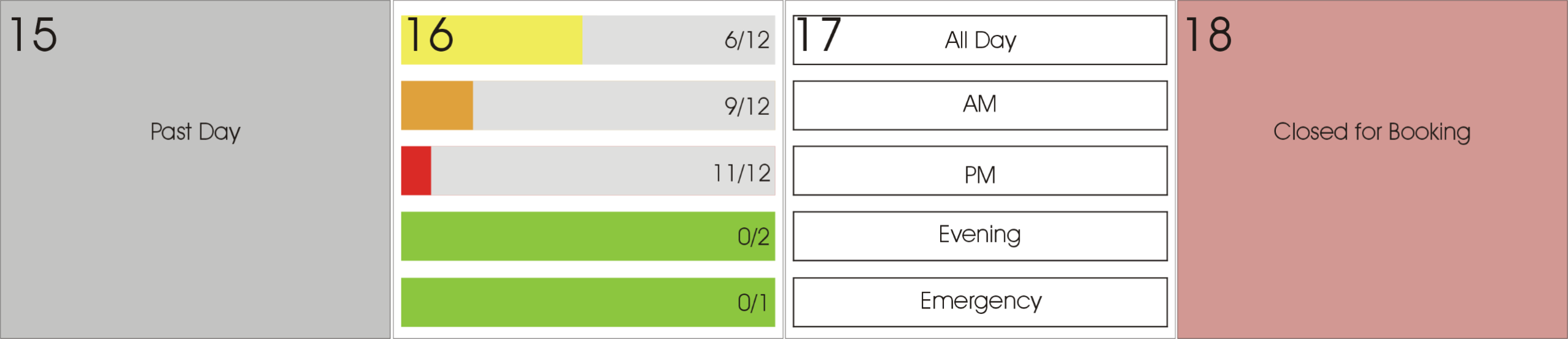 When there are no slots available, the day will turn red with no visible day segment bars. Past days are shown on the calendar in grey. You can right click on any day to view the total available appointments for that day.