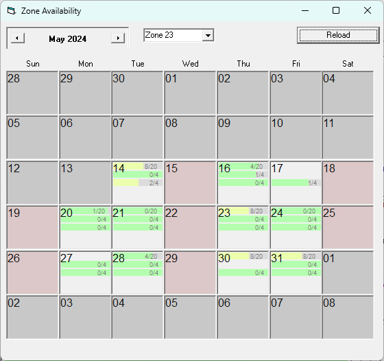 As appointments fill the day segments, the Zone Availability Calendar should be refreshed using the reload button. This will update the used slots displayed on each calendar day. The day segment bar will change color from green to yellow to orange to red as the allotted day segment appointments are booked.